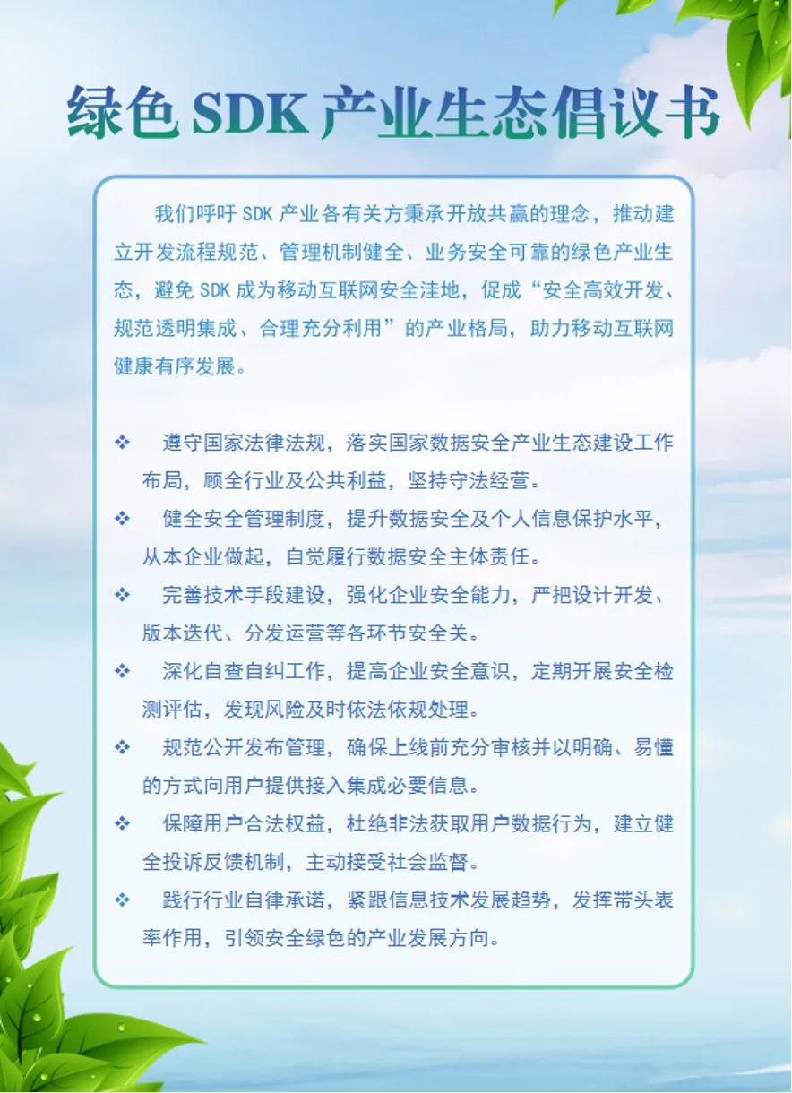 合理规范SDK产品开发、运维对行业整体安全水平提升、用户权益保障至关重要。近日,中国信通院拟发起“绿色SDK产业生态共建行动”,号召相关各方共同签署《绿色SDK产业生态倡议书》,强化行业自律,履行主体责任,促成“安全高效开发、规范透明集成、合理充分利用”的产业格局。