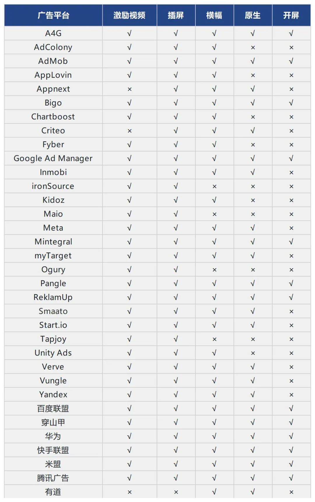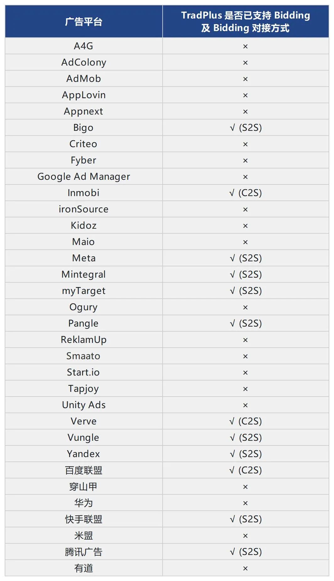 此外,Bidding 是广告平台的主流趋势,是否支持 Bidding 也是判断广告平台规模的标准之一。