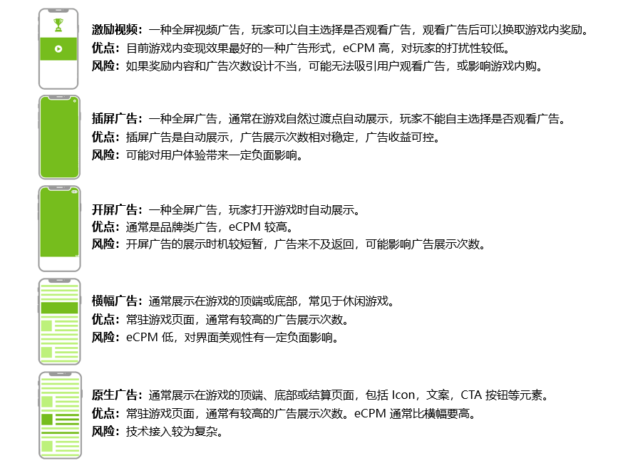 常见的广告样式分为激励视频、插屏、开屏、横幅和原生广告。