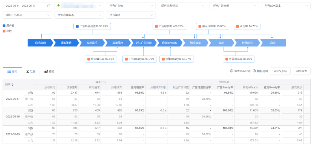 TradPlus的《漏斗分析报表》可以完整呈现聚合广告变现的所有漏斗转化率和指标,并支持应用、广告位、国家、渠道、SDK版本和应用版本等多种查看维度,能够帮助开发者快速发现收益流失在哪一步。