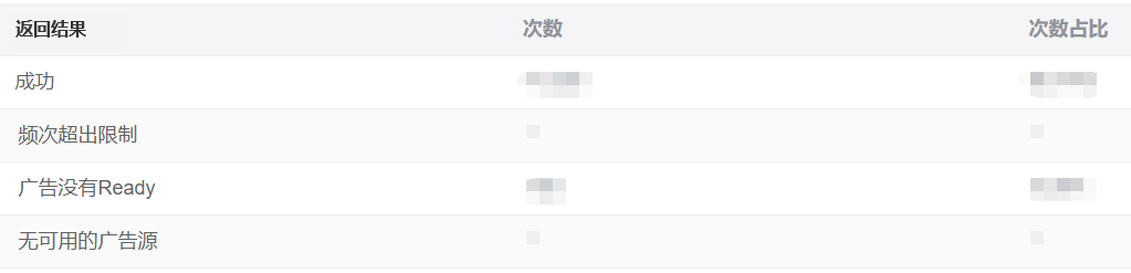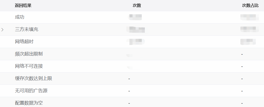 展示成功率即用户触发展示广告后,能够成功展示的比率。如果数据异常,可查看所有触发展示后的结果和对应次数,从而针对性的优化问题。