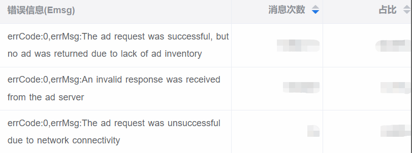 其中“三方未填充”指的是三方广告SDK返回的错误信息(如下图),每一种错误信息在三方广告平台都有含义说明,可以帮助开发者精准定位到填充异常的原因。